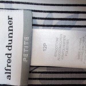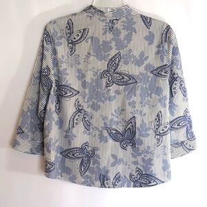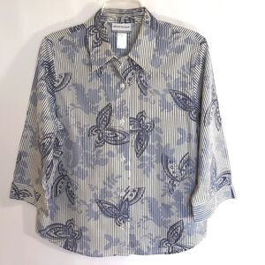 Alfred Dunner Blue Butterfly 3/4 sleeve Blouse. Size 12P. Off-White background with various shades of blue. Great blouse to pair with jeans or a jean skirt. Excellent pre-owned condition with no flaws.