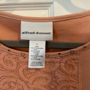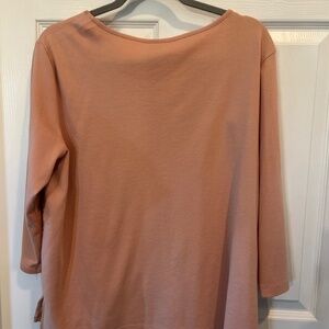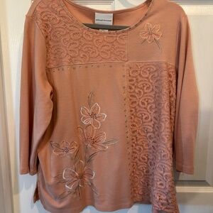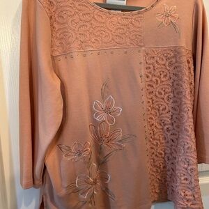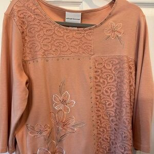 Chic, blush-colored top with flower embellishment and lovely lace details. Soft and stylish design. 60% cotton 40% polyester body. The lace is 70% cotton and 30% nylon. Pretty little studs on the neckline and in the design. Lightweight and easy to wear in all seasons. 3/4 length sleeves. Like new condition. Kept in very clean non-smoking environment. Make me an offer! Thanks for looking and have a blessed day.