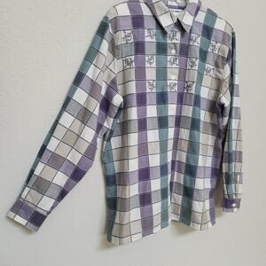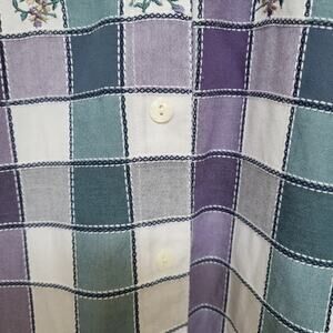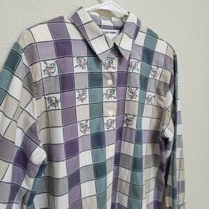 Alfred Dunner Button Up Shirt Womens 14 Floral Check Plaid Purple Embroidered