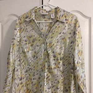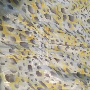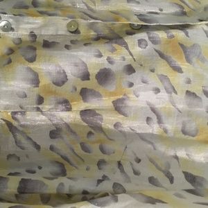 Yellow and gray with metallic threads, long sleeve, some elastic in back.