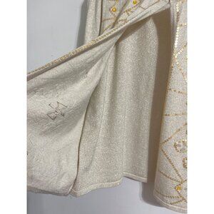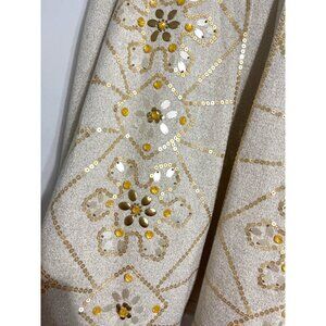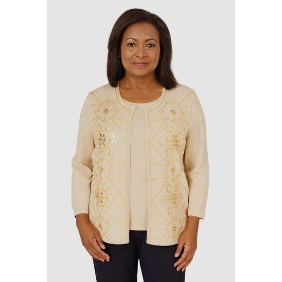 This Alfred Dunner champagne cardigan features an elegant shimmer knit with ornate gold-tone sequin and bead embellishments for a polished layered look.
