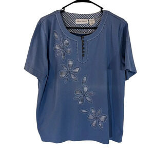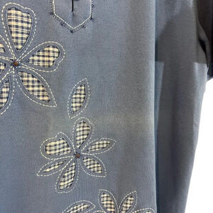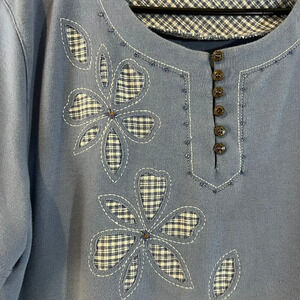 Alfred Dunner Dusty Blue Top Large Plaid Patchwork Flowers Beaded Cotton Blend