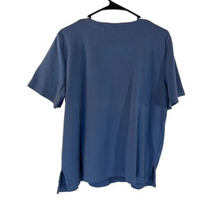This beautiful Alfred Dunner blouse is perfect for both casual and workwear occasions. With a round neckline and pullover closure, it features a lovely plaid patchwork design in a dusty blue color with accents of beaded flowers. The blouse is made with a comfortable knit fabric that is a blend of polyester, cotton, and cotton blend, making it machine washable for easy care.