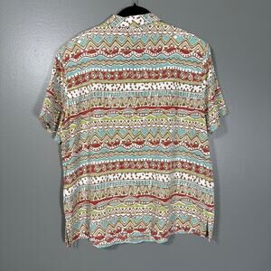 Women's plus size lightweight button up shirt by Alfred Dunner. This earth tone colored top has a tribal print in red, blue, green, and tan, short sleeves, and shoulder pads. It is 100% polyester.