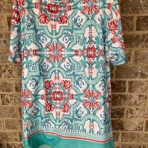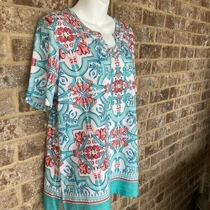 Alfred Dunner size Large top. Pretty design with gold studs embellished around neckline. 95% polyester 5% spandex. Armpit to armpit measures 21” . Shoulder to hemline measures 27”. Excellent preowned condition.