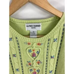 This Alfred Dunner sweater is so cute! It is green and has short sleeves and the embroidered detailing adds a touch of elegance and charm.