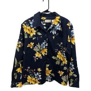Beautiful jacket by Alfred Dunner. Navy blue with vibrant floral pattern. Button Front closure. Side pockets. Rhinestone derail.
