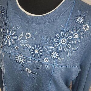 Classic blue crew neck sweatshirt from Alfred Dunner, featuring beautiful floral embroidery. A cozy and versatile piece, perfect for a vintage or cottagecore look.