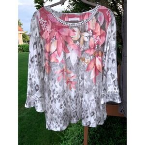 Keywords: Alfred Dunner, floral top, capri pants, womens set, matching set, embellished top, gray pants, womens clothing, plus size, xl, casual wear, comfortable, easy care