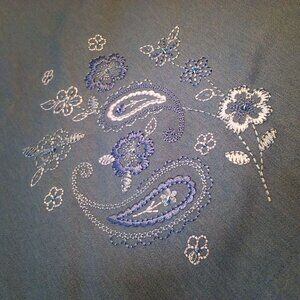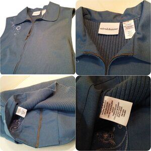 -- Alfred Dunner made in China, women-XL(16), logos tags labels, Boxy Sleeveless, zipper front cotton canvas, ribbed knit sweater back, peter pan collar neckline, floral embroidered stitching embellished beads decoration, washable cotton ramie polyester fabric in muted country blue colorway.