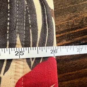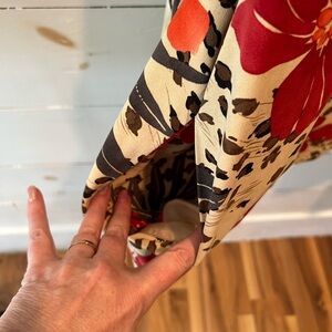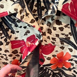 Vibrant floral print button-up shirt with red and orange flowers. Features a stylish collar and long sleeves. Pockets make it wearable as both a shirt or a jacket. Excellent preowned condition, smoke free home. Measurements are shown.