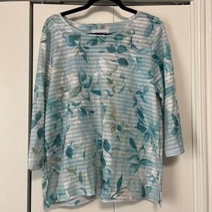 Alfred Dunner Floral Print Top Textured 3/4 Sleeve Blouse Blue Green L