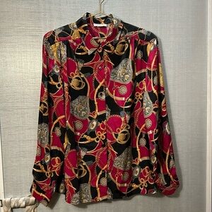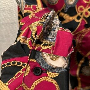 The shirt in the image is identified as an "Alfred Dunner" brand button-down shirt, featuring a print with chains, tassels, and other decorative elements in gold, black, and red tones. Alfred Dunner is known as a manufacturer of moderately priced ladies' coordinated sportswear. The brand caters to an older demographic, offering classic and comfortable styles