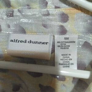 The Alfred Dunner Gauze Cotton Metallic Button-Down Shirt Blouse Top in size 16W features a classic fit with 3/4 sleeves, making it suitable for casual occasions. The top showcases a colorful animal print pattern with metallic accents, adding a touch of style to the blouse. Made from a comfortable cotton blend material, this plus-size blouse is designed for women who appreciate a fashionable and versatile addition to their wardrobe. The collared neckline and button-down style make it a timeless piece that can be dressed up or down for various looks.