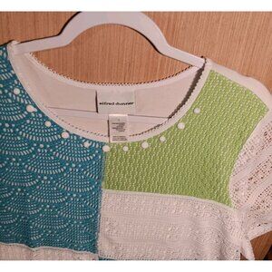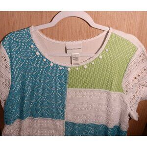 Elevate your casual wardrobe with this beautiful blue green white blouse from Alfred Dunner. The beaded neckline adds a touch of elegance to this basic style top. It's made of a comfortable knit fabric that is easy to care for, machine washable and perfect for everyday wear. The short sleeves and pullover closure make it a hassle-free experience to wear this top.