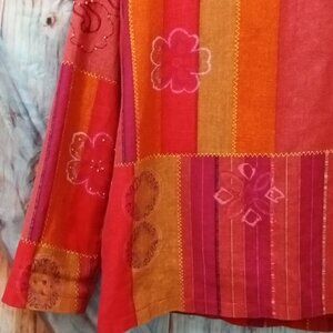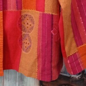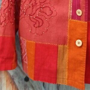 The Alfred Dunner Lined Beaded Linen Patchwork Blazer Jacket in size 10 is a stylish and versatile outerwear piece perfect for both casual and business occasions. Made from a linen blend outer shell with a polyester lining, this jacket features a patchwork design in shades of orange, long sleeves, button front closure, and padded shoulders for a trendy and comfortable fit. With accents like hidden side pockets and beading details, this jacket is a fashionable choice for summer, fall, and spring seasons. Made by the reputable brand Alfred Dunner, this jacket is sure to add a pop of color and flair to any outfit.