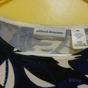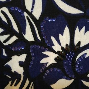 Stunning sweater! Shades of white and navy blue. Adourned with blue and black sequins. Lightweight knit and highly versatile. Can be worn with pants, skirts, or jeans. Some very small knicks that are unnoticeable, otherwise in excellent condition. Very elegant and classy.
