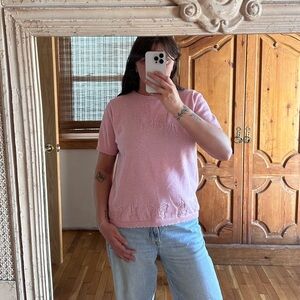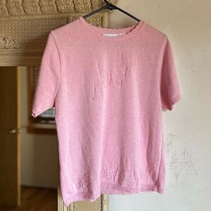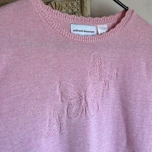 Alfred Dunner Medium Pink Scalloped Edge Butterfly Pink Knit Top Charming pink knit top. Features subtle butterfly embroidered design. Perfect for casual wear.
