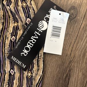 Vibrant pants with a dynamic pattern. Features shades of purple, gold, and cream.
