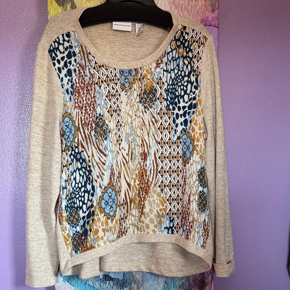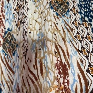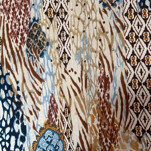 Chic sweater with vibrant patterns. Features blue, brown, and gold accents. Perfect for casual elegance. Lightweight. Smoke and pet free home.