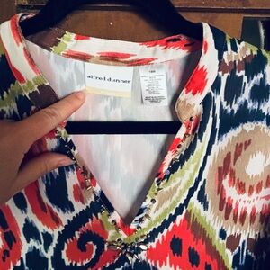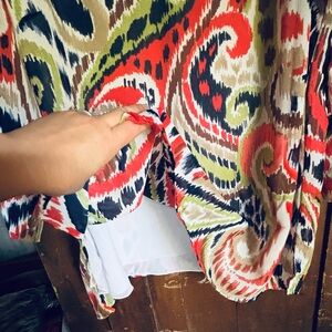Bold paisley design with coral, tan, brown, green, and navy blue. Flowy and stylish with beaded neckline. Lightweight and airy lined flowy Vacation Vibes top. Pair with some Summer white flowy capris and your nice vacation hat and head to the water in this beautiful top. Nice enough for business casual or vacation attire. It has an almost Tie Dyed look to the fun design. The sleeves are about a 3/4, maybe a hair longer. Size 18 W Like new condition with no tags.