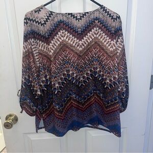 Stylish blouse with vibrant zigzag pattern. Features tie sleeves and relaxed fit. Ideal for casual outings.