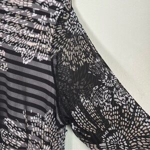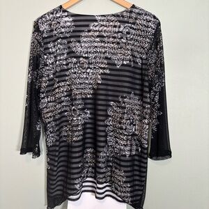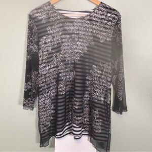 Alfred Dunner Opposites Attract Floral Mesh Stripe Top-Black/ White-Women Large