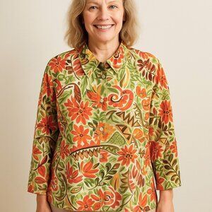 Alfred Dunner Orange Green Floral Print Button Up Semi Sheer Top Womens Size 14