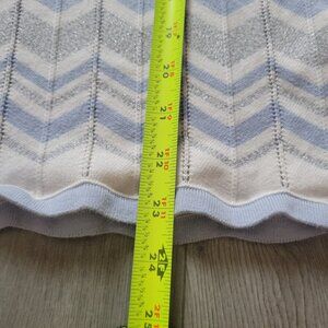 This chevron-patterned knit top combines light blue and white tones with metallic thread accents. Designed for petite sizes, it offers a comfortable fit and stylish neckline detail.