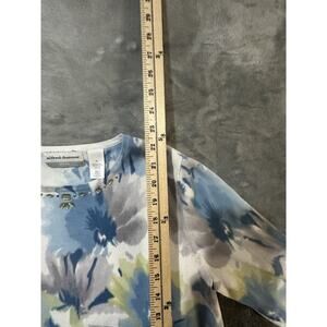 Beautiful Alfred Dunner Petite Large (PL) floral knit top with delicate embellishments along the neckline. Features soft tones of blue, green, gray, and white in a watercolor floral print. A lightweight knit blend provides stretch and comfort, perfect for everyday wear, travel, or casual gatherings.