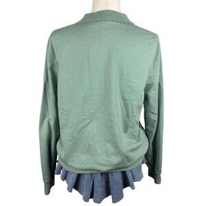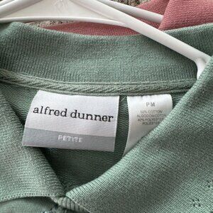 Cozy Alfred Dunner sweatshirt in a soft sage green with delicate embroidered floral detailing. Features a peter pan-style collar and diamond patchwork texture for a sweet vintage look. Made with a comfy cotton blend and ribbed hem that gives it a relaxed fit. Perfect for cottagecore lovers or anyone who loves a soft, nostalgic aesthetic. Excellent condition.