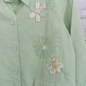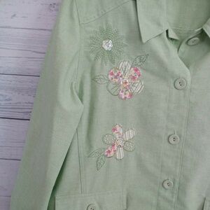 Alfred Dunner Petite Spring Jacket Nwot Size 12p. This jacket has flowers embroidered with sequins and little white beads. From pit to pit it measures 21". Top to bottom measures 24.5". The sleeves measure 22.5". It buttons up and has pockets in the front that button also!