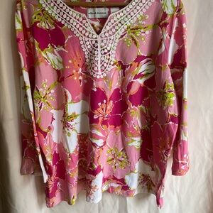 This Alfred Dunner blouse showcases a soft pink color with a striking graphic floral design, enhanced by an elegant bib collar. The tunic style and embellished details offer a relaxed yet stylish fit, perfect for a chic and comfortable ensemble.