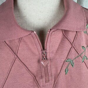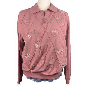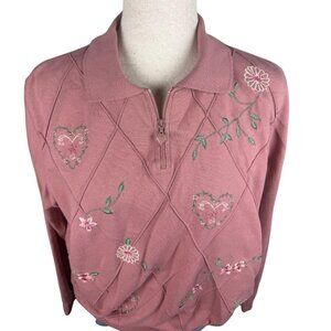 Alfred Dunner Pink Floral Embroidered Quarter Zip Sweatshirt Women’s Large