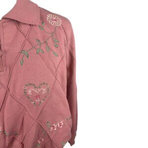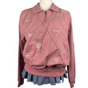 Vintage-inspired Alfred Dunner sweatshirt in a dusty rose pink hue with embroidered hearts and floral detailing. Features a cozy ribbed hem, subtle diamond texture, and zip-up collar for that perfect retro grandmacore aesthetic. Soft midweight feel, ideal for cooler weather. In excellent vintage condition with no visible flaws.