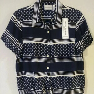 Alfred Dunner Print Blouse Top. Size 8 petite. Blue and white print top. Button down and tie at waist.