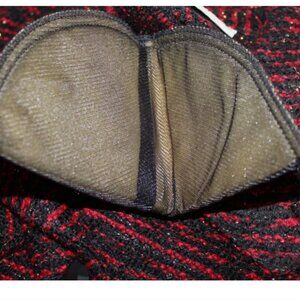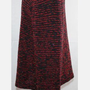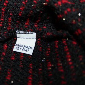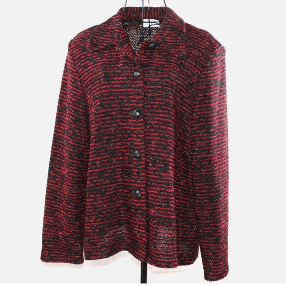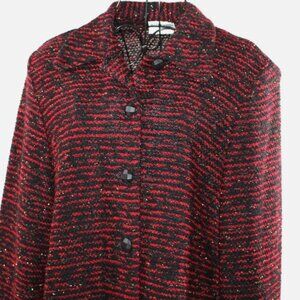 Alfred Dunner black and red lightweight blazer jacket with gold flecks. Button front, shoulder pads, size 14 (bust is 42", length is 25 1/2", sleeve length is 24", shoulder seam to shoulder seam in back is 18"). Made in USA. No fabric tag, feels like polyester or acrylic.