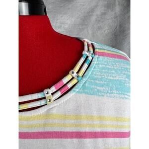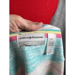Add a pop of color to your wardrobe with this beautiful Alfred Dunner short-sleeved top. Featuring a round neckline and a pullover closure, this top is perfect for casual occasions. The top is made of 95% cotton and 5% spandex, making it comfortable and machine washable. The double-lined neckline with bling accents adds a touch of elegance to the colorful striped pattern. This top is perfect for petites and comes in size PXL. It is a regular fit and has short sleeves. The top is suitable for all seasons, including winter, summer, fall, and spring. Made in China, this top is perfect for anyone who loves colorful and stylish clothing.