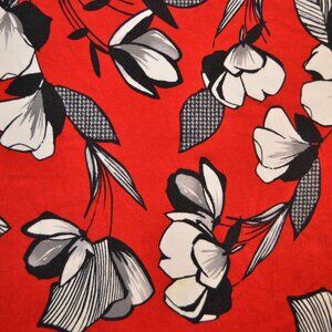 Alfred Dunner cotton blouse. Features a relaxed fit and latticework neckline detail with studs. Black and white graphic flowers on a cherry red field. Cotton with elastane is comfortable and breathable. In excellent pre-owned condition.