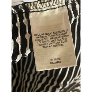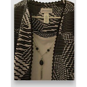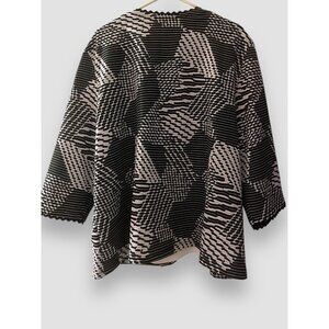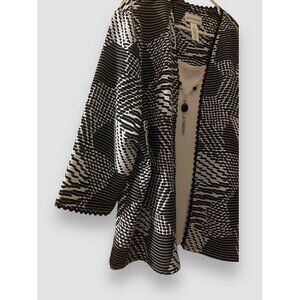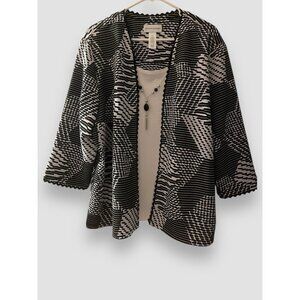 Alfred Dunner Women's Top with Built in Blouse in Size XL. The geometric pattern in black and white adds a touch of elegance to this classic fit jacket, perfect for any occasion from travel to workwear, and everything in between. The knit fabric type and polyester with spandex outer shell material make it comfortable to wear all year round in any season