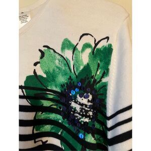 Pretty Spring sweater has black & white stripes and beautiful floral designs embellished with sequins. It has a rounded neckline with short sleeves. NWT