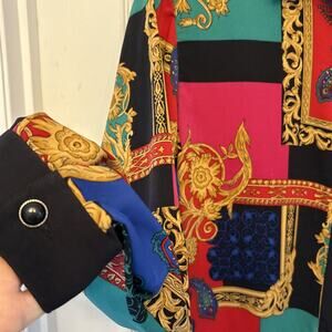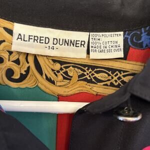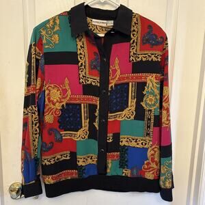 This Alfred Dunner Semi Top in women's size 14 features an elegant scroll patterns in red, black, pink, and blue tones. Made of polyester, with.cotton cuffs and collar it has long sleeves with button cuff sleeves and a collared neckline with buttons down the front , but is overhead style due to waistline. The lightweight fabric makes it suitable for various occasions including travel, casual wear, and business meetings. The colorful scroll designs theme adds a touch of vibrancy to the basic style blouse, making it a versatile addition to any wardrobe for all seasons.