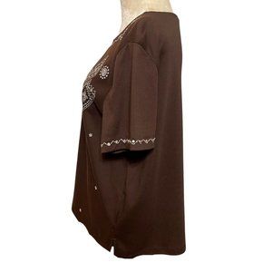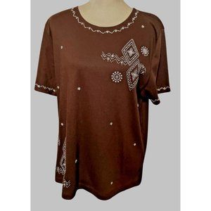 Alfred Dunner Shirt Womens L Brown Short Sleeve Crewneck Embellished Shirt Top