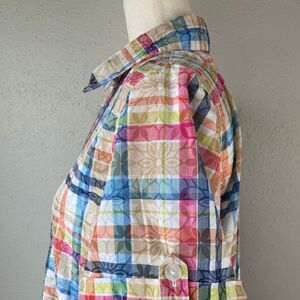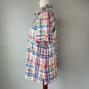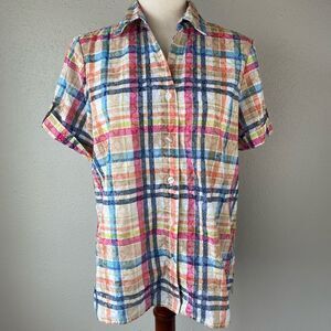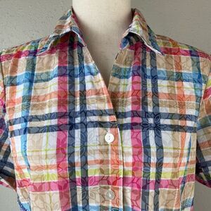 Super cute and colorful button-down shirt by Alfred Dunner measuring 20 inches armpit to armpit when laying flat and 25 inches in length from the shoulder to the hem.