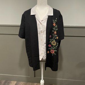Alfred Dunner Short Sleeve black Jacket with sewn-in white collared shirt. One piece item. Shirt isn't removable. Beautfiul embroidery on jacket with sequins in green, orange, yellow, pink, purple and red.