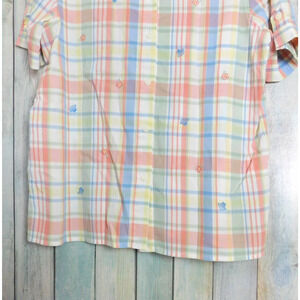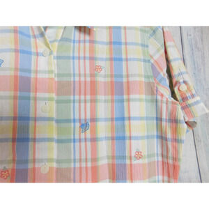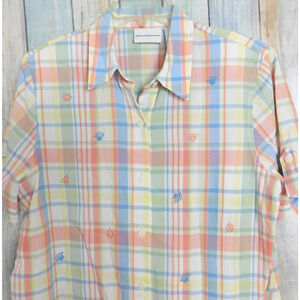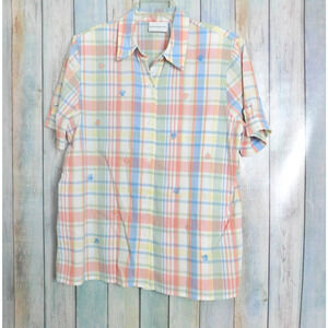 Alfred Dunner Short Sleeve Shirt 12 Large White Pink Plaid Embroidered Flowers