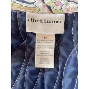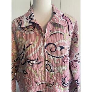 Alfred Dunner quilted spring jacket in a size 14. It is a pink floral print perfect for spring! 2 side pockets with a front zip. Unlined.