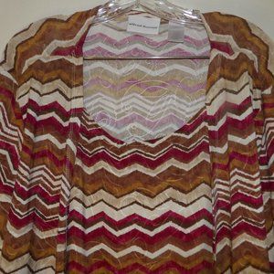 twofer top looks like tank under a long sleeve cardigan but is one piece , Aztec Patterned geometrical print has a slightly raised textures , tones are maroon/brown/cream , material is 92% Polyester 8% Spandex , Sz L measurements are roughly 27" from shoulder to hem and about 24" pit to pit , good pre owned or used condition no holes or stains shows minor washing wear , pet friendly non smoking home