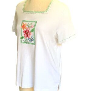 Alfred Dunner Square Neck Top Floral Embroidery Gingham Beaded Sequins M 33P