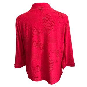This Alfred Dunner Studio set offers a vibrant red floral lace cardigan paired with a matching tank. Lightweight and breathable, it's versatile for layering or standalone wear, providing elegance and comfort for your wardrobe. Looks more like petite because measures 21” from shoulder to hem.